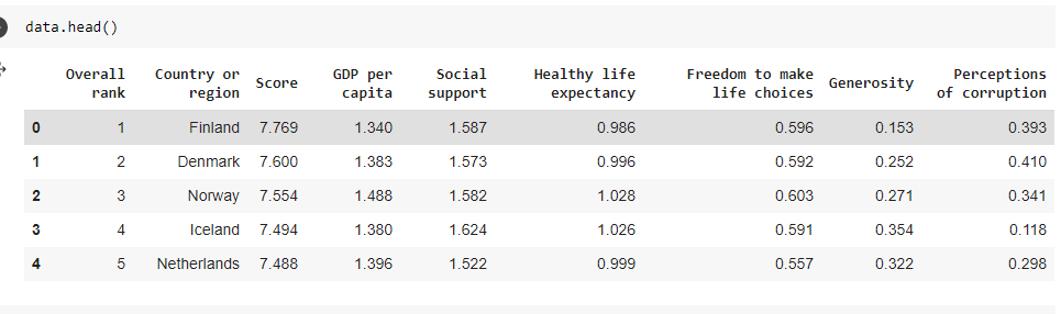 Let’s take the example of the happiness index of world wherein 6 factors conclude the score of a country which in turn results as an overall rank. Here is the code in Jupyter notebook to analyse this data.